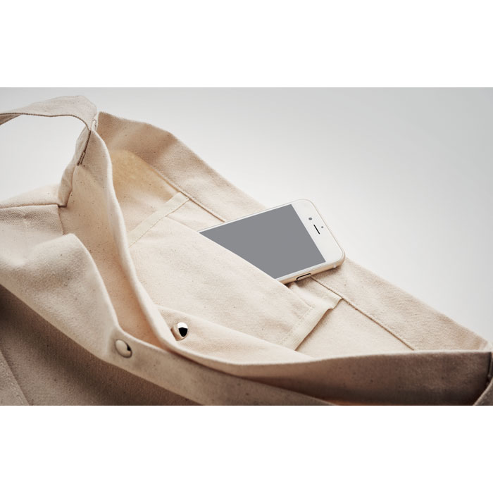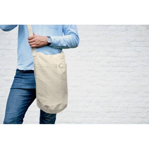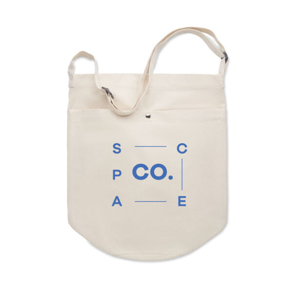 Διαφημιστική Τσάντα από βαμβάκι 270 gr/m² με εκτύπωση ή θερμομεταφορά ή ψηφιακή θερμομεταφορά ή και κέντημα των στοιχείων της επιχείρησής σας. Διαθέτει εσωτερική θήκη, μπροστινή τσέπη με κλείσιμο τρουκ και ρυθμιζόμενο ιμάντα μεταφοράς. Δύναται να φορεθεί και χιαστί.