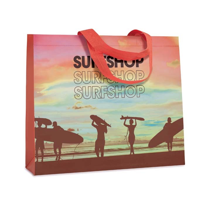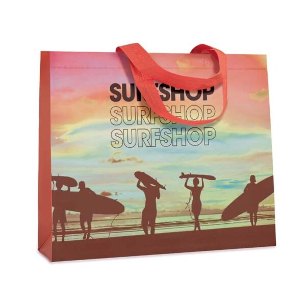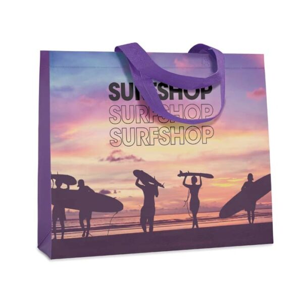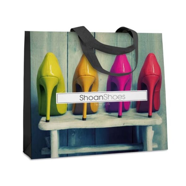Διαφημιστική Τσάντα επαναχρησιμοποιούμενη με μακριές λαβές κατασκευασμένη από γυαλιστερό μη υφαντό ύφασμα πολυεστέρα ΡΡ 140gsm και εκτύπωση του σχεδίου και των στοιχείων της επιχείρησής σας. Ιδανική για τα ψώνια.