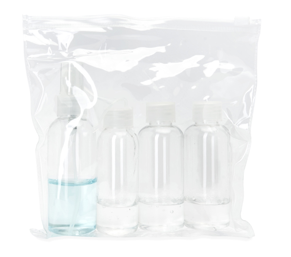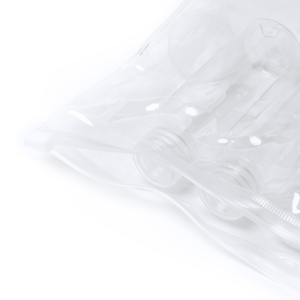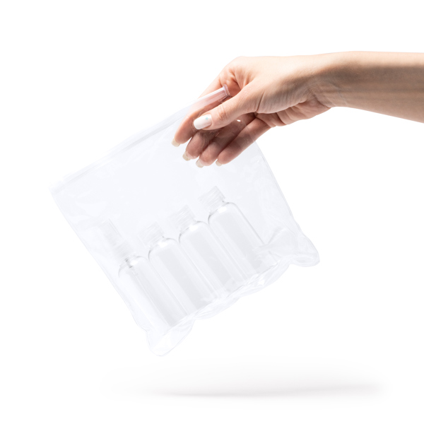 Διαφημιστική Τσάντα Ταξιδίου επανασφραγιζόμενη από διάφανο PVC με εκτύπωση των στοιχείων της επιχείρησής σας. Περιλαμβάνει ποικιλία διάφανων μπουκαλιών για ζελέ, σαμπουάν & άρωμα (συγκεκριμένα 3 μπουκάλια, 1 σπρέι & 1 αντάπτορα).