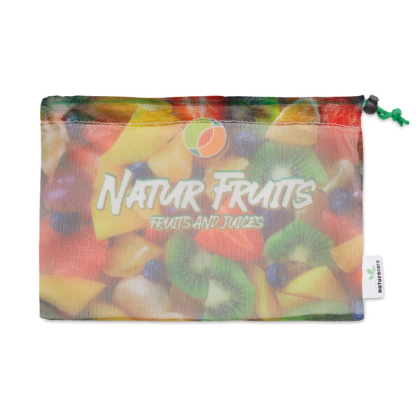 Διαφημιστική Τσάντα Φαγητού επαναχρησιμοποιούμενη, κατασκευασμένη από ανακυκλωμένο πολυεστέρα PET με χρωματιστό κλείσιμο από πλαστικό και εκτύπωση του σχεδίου και των στοιχείων της επιχείρησής σας. Διαθέτει πιστοποιητικό FCA. Ιδανική για φρέσκα λαχανικά και φρούτα.