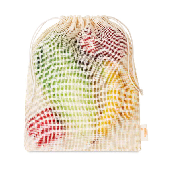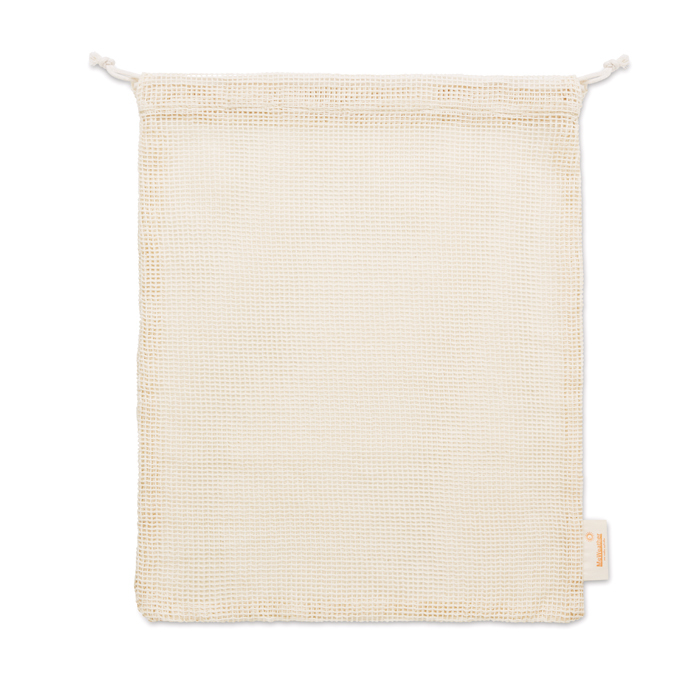 Διαφημιστική Τσάντα Φαγητού επαναχρησιμοποιούμενη, κατασκευασμένη από 100% βαμβάκι σε διάτρητο σχέδιο με εκτύπωση του σχεδίου και των στοιχείων της επιχείρησής σας. Διαθέτει κορδόνι περίσφιξης. Ιδανική για φρούτα και λαχανικά.
