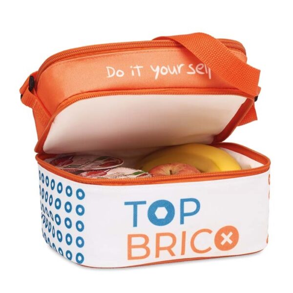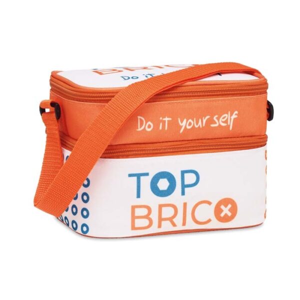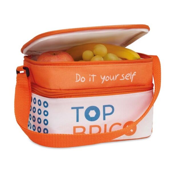 Διαφημιστική Τσάντα-Ψυγείο μικρού μεγέθους από πολυεστέρα 600D με εκτύπωση του σχεδίου και των στοιχείων της επιχείρησής σας. Διαθέτει 2 τμήματα με εσωτερική μονωτική επίστρωση αφρού 4mm EPE και εξωτερική επίστρωση από λευκό πολυεστέρα PEVA με κλείσιμο φερμουάρ. Ιμάντας μεταφοράς.