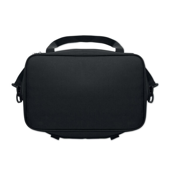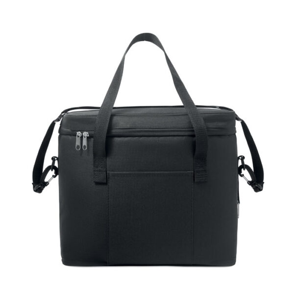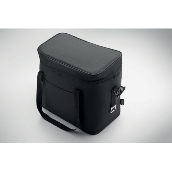 Διαφημιστική Τσάντα-Ψυγείο από πολυεστέρα 600D RPET με εξωτερική επίστρωση από δερματίνη PU και θερμομεταφορά ή ψηφιακή θερμομεταφορά ή και μεταξοτυπία των στοιχείων της επιχείρησής σας. Περιλαμβάνει κύρια θήκη με ισοθερμική μόνωση αφρού PEVA 6mm PE και μία εσωτερική διχτυωτή τσέπη με κλείσιμο φερμουάρ, μία μπροστινή τσέπη, δύο χειρολαβές και ρυθμιζόμενο ιμάντα ώμου. Χωρητικότητα: 18L.