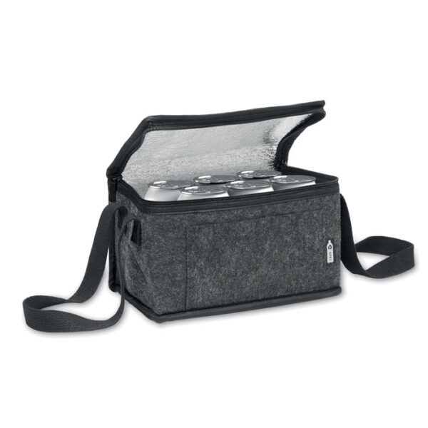 Διαφημιστική Τσάντα-Ψυγείο από τσόχα RPET με εκτύπωση ή θερμομεταφορά ή και ψηφιακή θερμομεταφορά των στοιχείων της επιχείρησής σας. Διαθέτει εσωτερική μόνωση πλαστικοποιημένου αλουμινίου πάχους 3mm, εξωτερική μπροστινή τσέπη και ιμάντα μεταφοράς. Κλείσιμο με φερμουάρ. Πάχος τσόχας: 1mm.