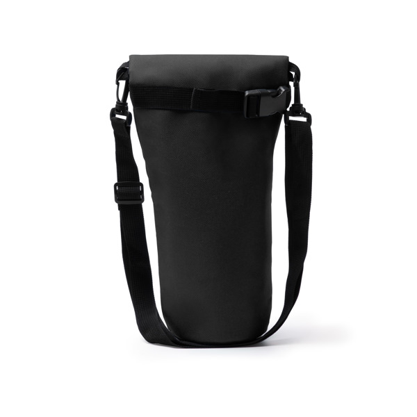 Διαφημιστική Τσάντα-Ψυγείο για μπουκάλια έως 1,5 L, κατασκευασμένη από πολυεστέρα RPET 600D με μεταξοτυπία ή θερμομεταφορά των στοιχείων της επιχείρησής σας. Στο εσωτερικό διαθέτει θερμομόνωση για να διατηρεί τα ποτά στη βέλτιστη θερμοκρασία, κλείσιμο φερμουάρ στο πάνω μέρος με ρυθμιζόμενη πόρπη και ρυθμιζόμενο λουράκι ώμου (μήκους 120cm) με καραμπίνερ και στα δύο άκρα για εύκολη μεταφορά.