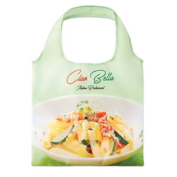 Διαφημιστική Τσάντα επαναχρησιμοποιούμενη και αναδιπλούμενη με μονή στρώση από ανθεκτικό πολυεστέρα rPET και εκτύπωση του σχεδίου και των στοιχείων της επιχείρησής σας. Διαθέτει εσωτερική τσέπη. Ιδανική για τα ψώνια.