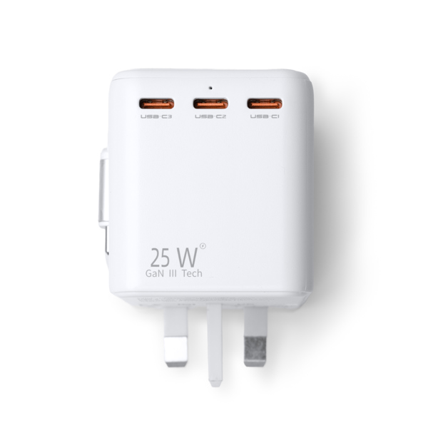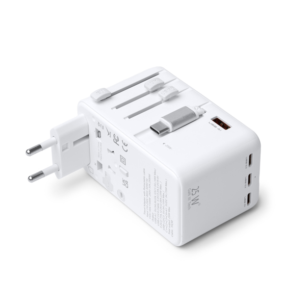 Διαφημιστικός προσαρμογέας φόρτισης (adapter) ταξιδιού γενικής χρήσης από πολυκαρβονικό υλικό υψηλής ποιότητας με εκτύπωση των στοιχείων της επιχείρησής σας. Διαθέτει μέγιστη ισχύ 25W για γρήγορη φόρτιση με κατάλληλα καλώδια, έξοδο USB, τρεις εξόδους Type-C και αναδιπλούμενο καλώδιο σύνδεσης Type C. Κατάλληλος για χρήση σε Ευρώπη, Ηνωμένο Βασίλειο, ΗΠΑ, Ασία και Αυστραλία. Περιλαμβάνεται εγχειρίδιο οδηγιών σε 6 γλώσσες.