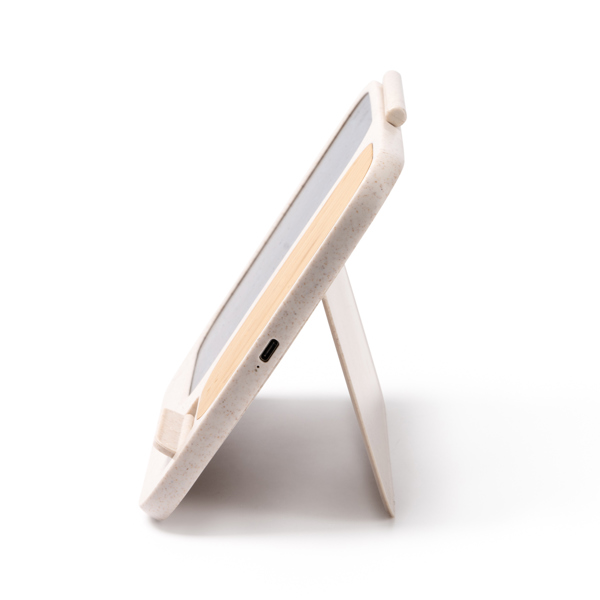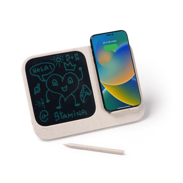 Διαφημιστικός Ψηφιακός Πίνακας Γραφής με γραφίδα κατασκευασμένος από μπαμπού με εκτύπωση ή χάραξη laser των στοιχείων της επιχείρησής σας. Διαθέτει λειτουργία ασύρματης φόρτισης 15W, ενώ περιλαμβάνονται καλώδιο τύπου C, μπαταρίες και εγχειρίδιο οδηγιών σε 6 γλώσσες: Ισπανικά, Αγγλικά, Γαλλικά, Ιταλικά, Πορτογαλικά και Γερμανικά. Συμβατός με κινητές συσκευές που είναι εξοπλισμένες με λειτουργία ασύρματης φόρτισης.